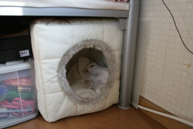 ベッドの中にリングマットを敷いて、それをフリースで包んで完成!