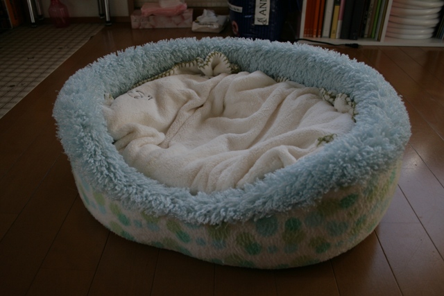 ベッドの中にリングマットを敷いて、それをフリースで包んで完成!